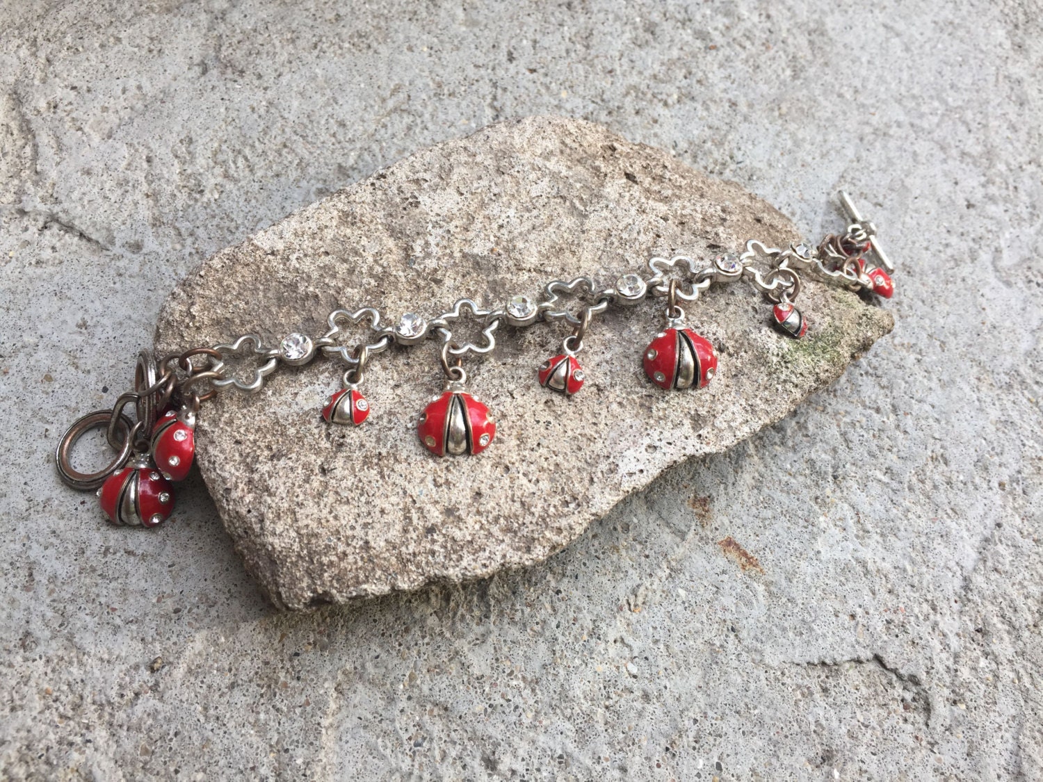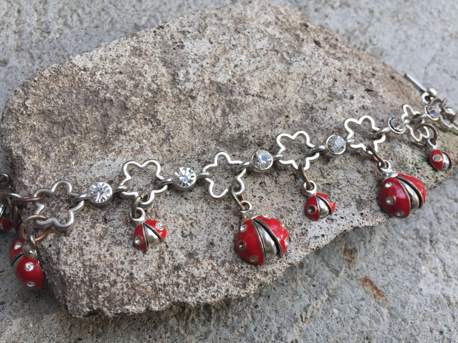 Available is this beautiful and fun silver ladybug charm bracelet with clear rhinestones. This bracelet features silver flower bracelet links with ladybug charms that contain clear rhinestones on their wings and clear rhinestone links in between the silver flowers. The bracelet measures about 7 1/4 inches long from end to end.