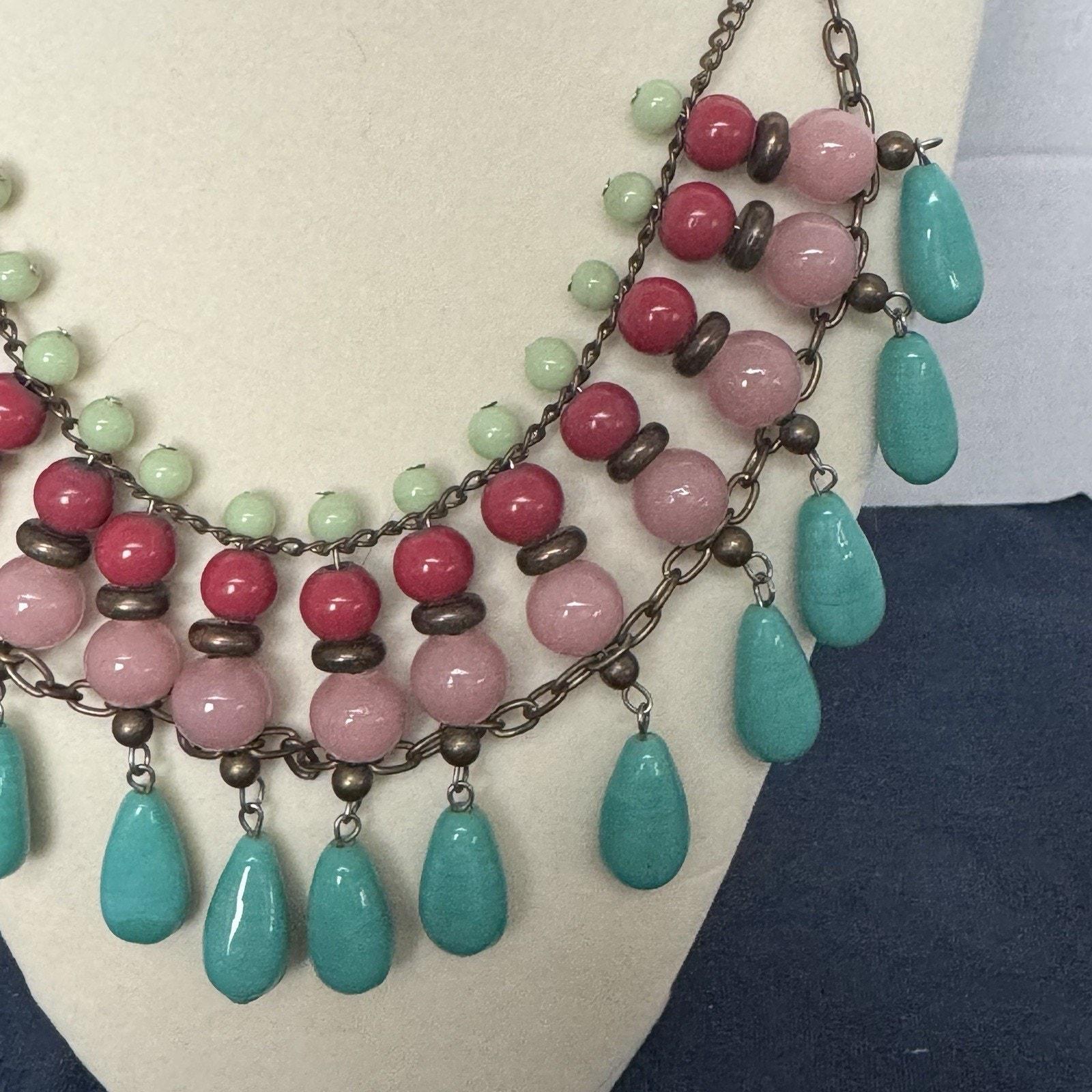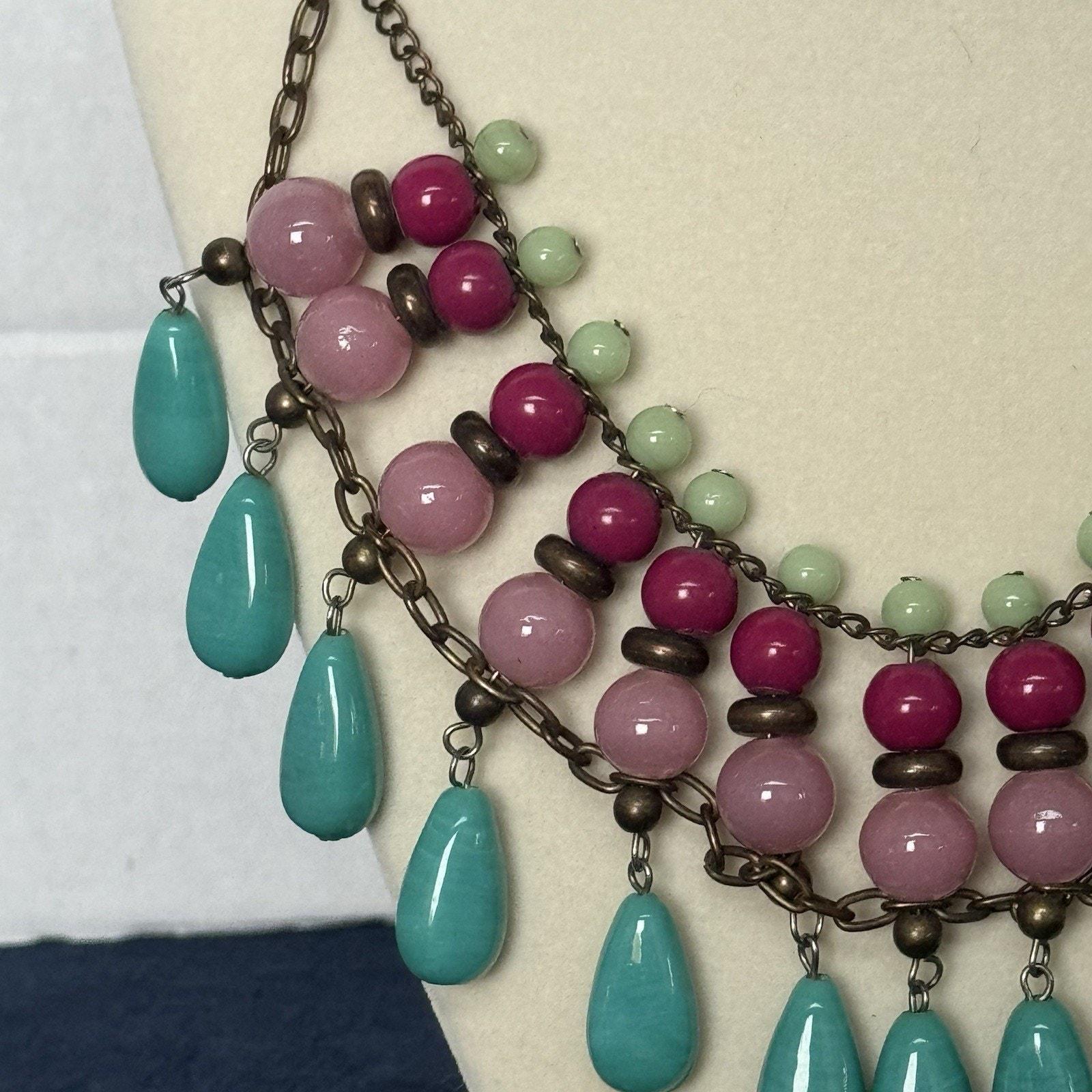 This vintage Egyptian revival necklace from M & S is a beautiful addition to any jewelry collection. The necklace features a collar of turquoise, pinks, and green glass beads with a bronze metal chain. The necklace measures 17 inches in length with an additional 3 inch extender chain and is in great condition.