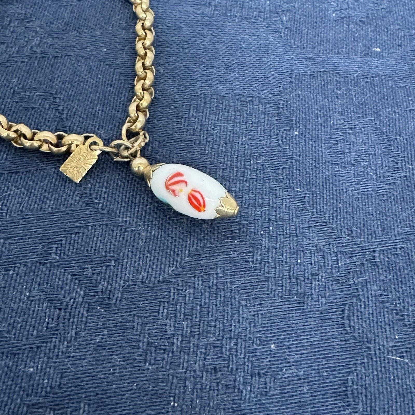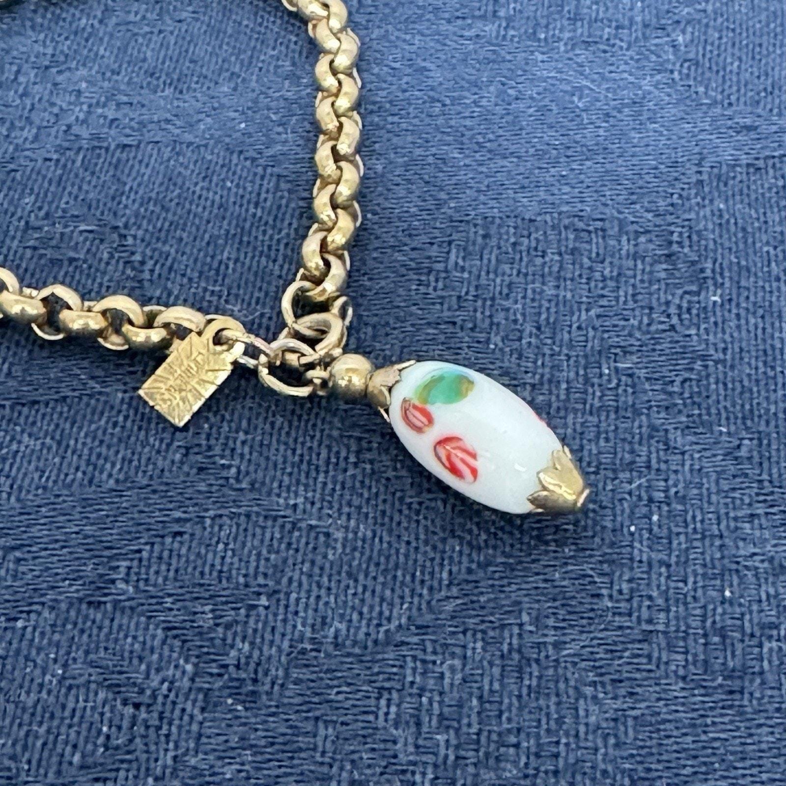 This vintage Emmons gold tone bracelet features a unique snail chain link design and is signed by the brand. The bracelet measures 7.75 inches in length and has a spring ring closure. It is perfect for any occasion and is in wonderful condition. At the end of the bracelet is a white, red and green glass bead that adds a simple but lovely appearance.