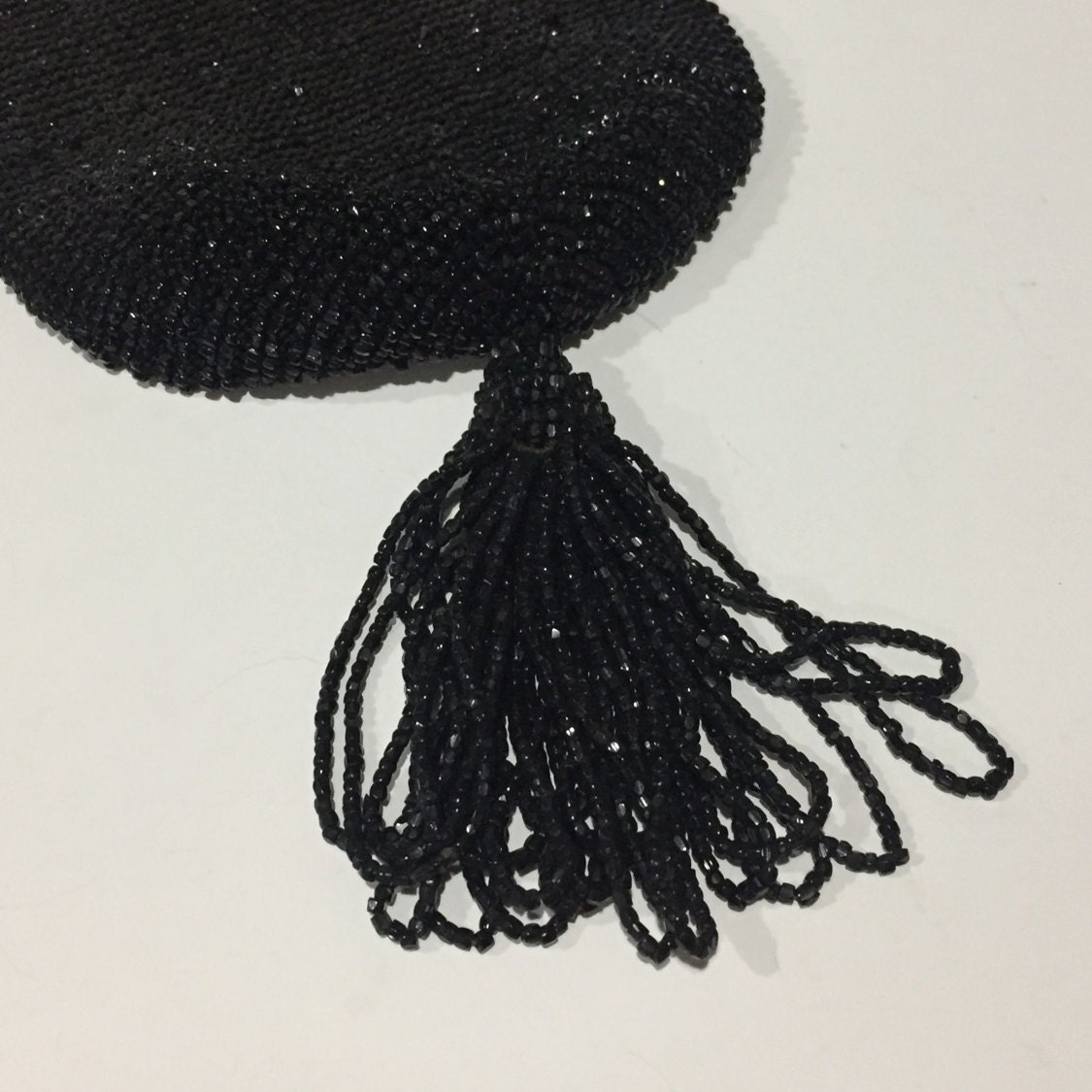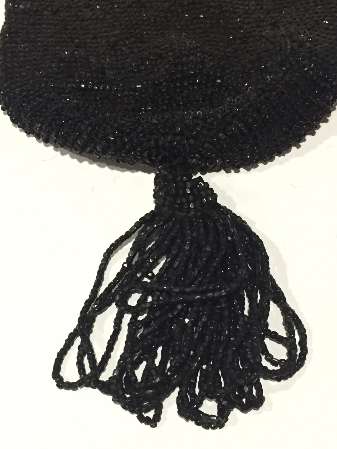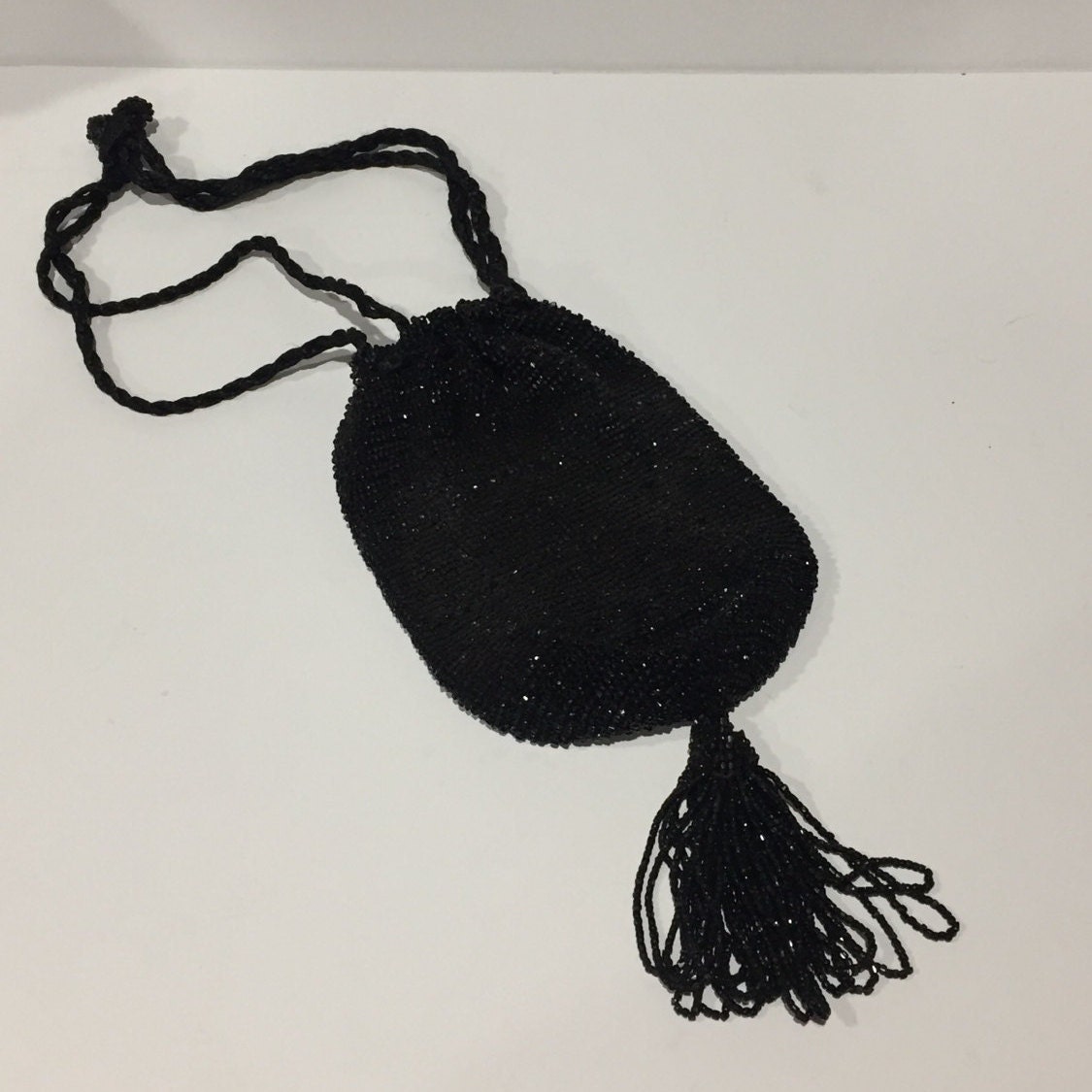 Available is this beautiful black seed beaded drawstring purse that would add a wonderful compliment to your special event. The purse measures about 6 1/2 inches tall and 4 1/4 inches wide. The tassel hanging off at the bottom measures a little over 3 inches long. This lovely purse would look perfect at your wedding, prom or cocktail party event. Purse is in great condition.