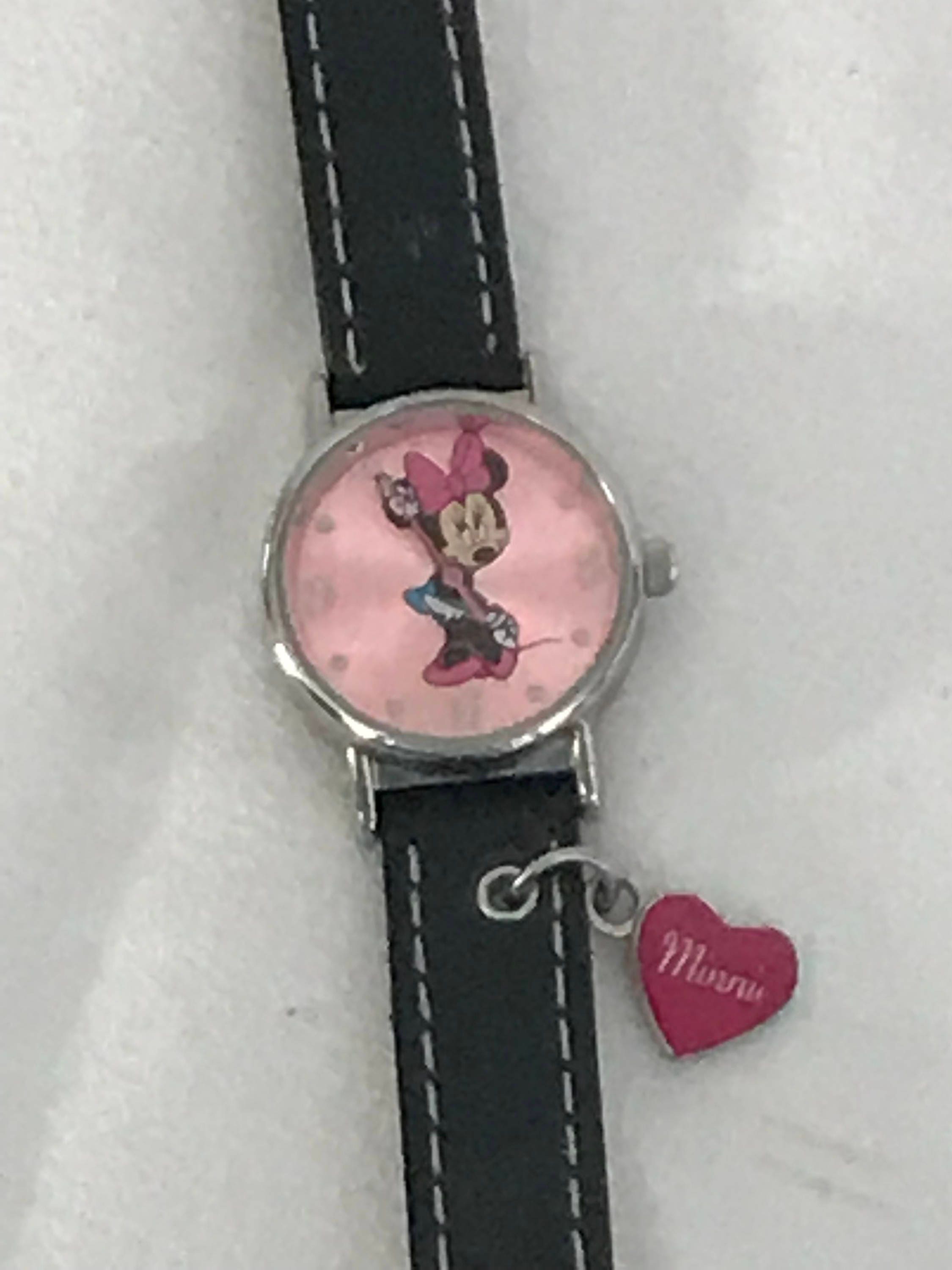 Available is this wonderful Disney Minnie Mouse Watch from Walt Disney World. The watch is a black band with a pink watch face containing Minnie Mouse. Her arms are the watch hands for the hours and minutes and the watch band contains a heart charm. This watch is in great condition and appears to only have been worn a couple times. There are small very minor scratches on the glass face but not noticeable unless you are looking really close. This would make a great gift for the Disney lover.